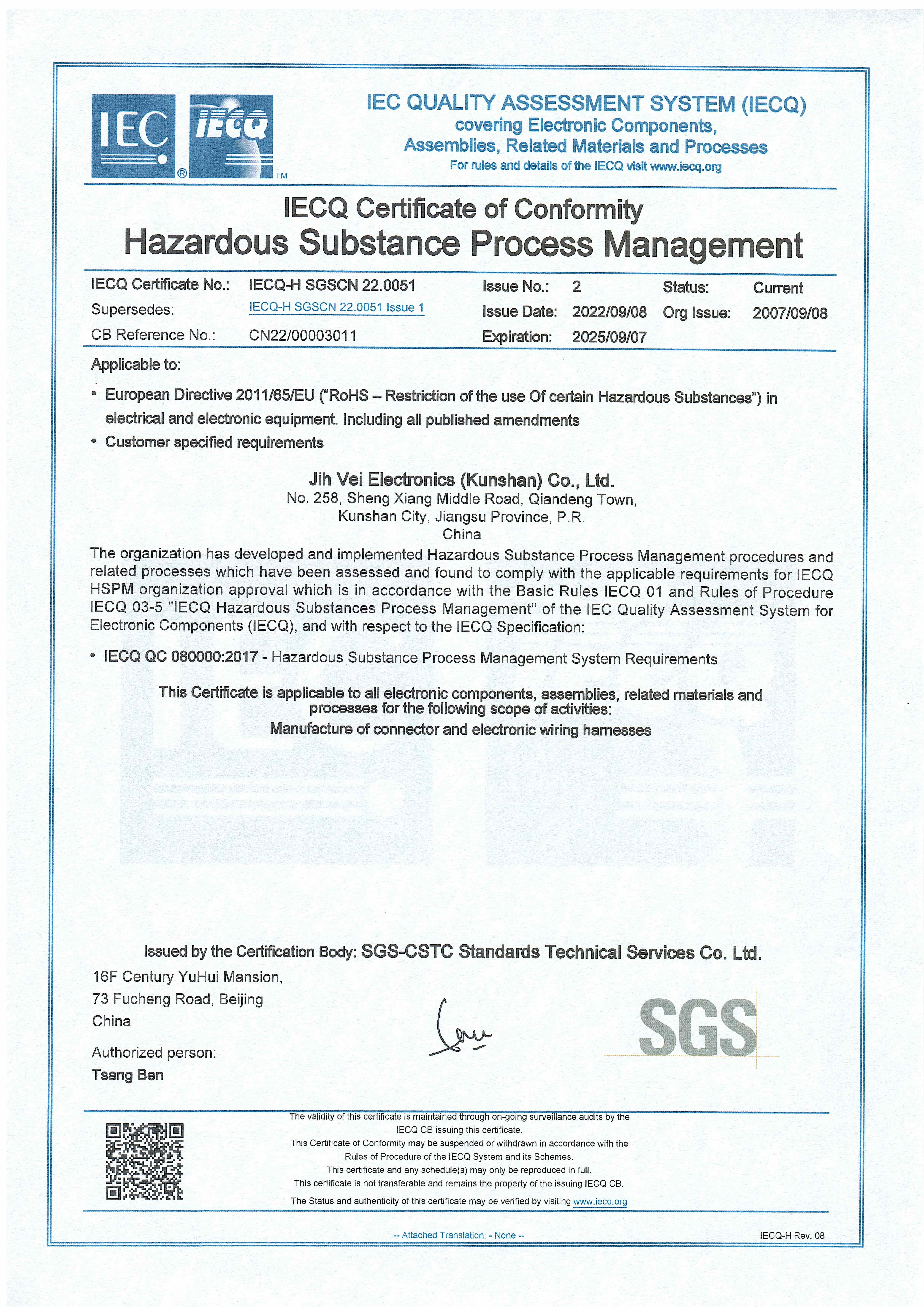 通過SGS公司驗証的QC080000有害物質管理體系